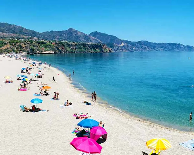 Burriana Beach in Nerja, Malaga, is one of the most popular and visited beaches in the municipality. It stretches over 800 metres in length and 40 metres in width, with fine golden sand. Surrounded by a promenade, it offers a wide variety of services, including shops, restaurants, beach bars, and water sports equipment rentals such as kayaks and jet skis. The waves are moderate, making it ideal for families. It also has a beach library and has been awarded the Blue Flag and the Q for Tourism Quality.