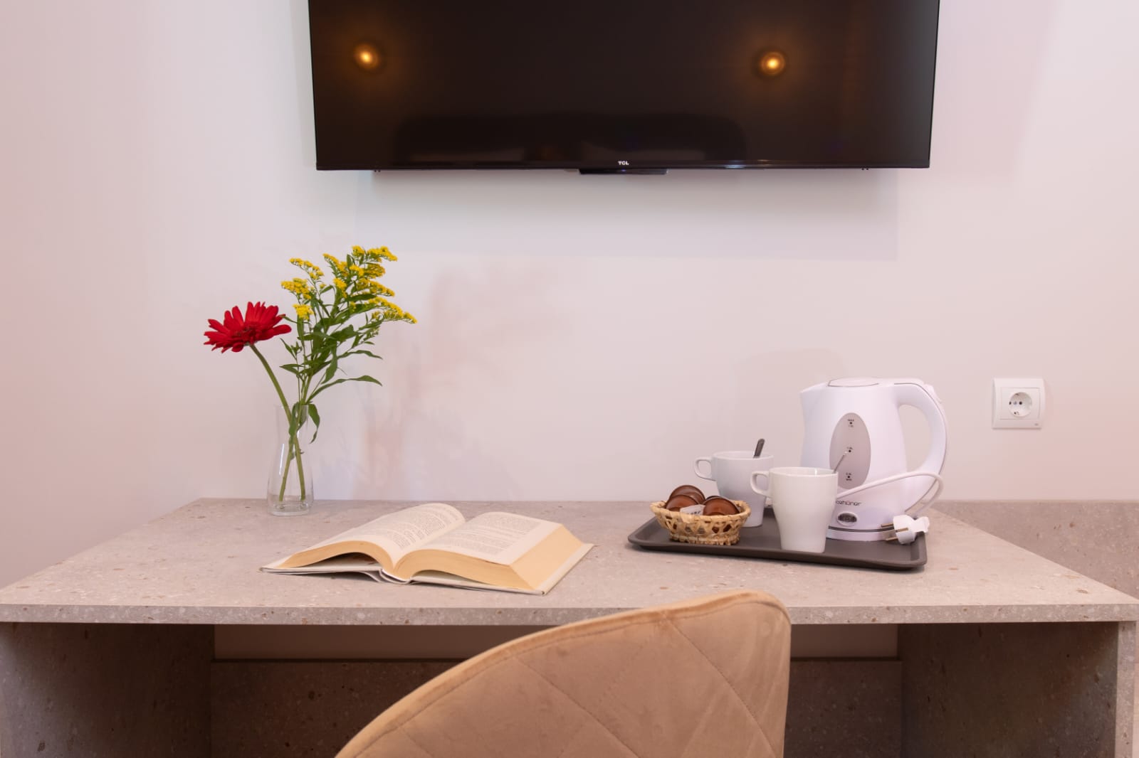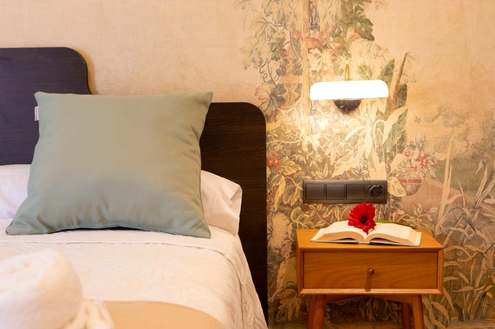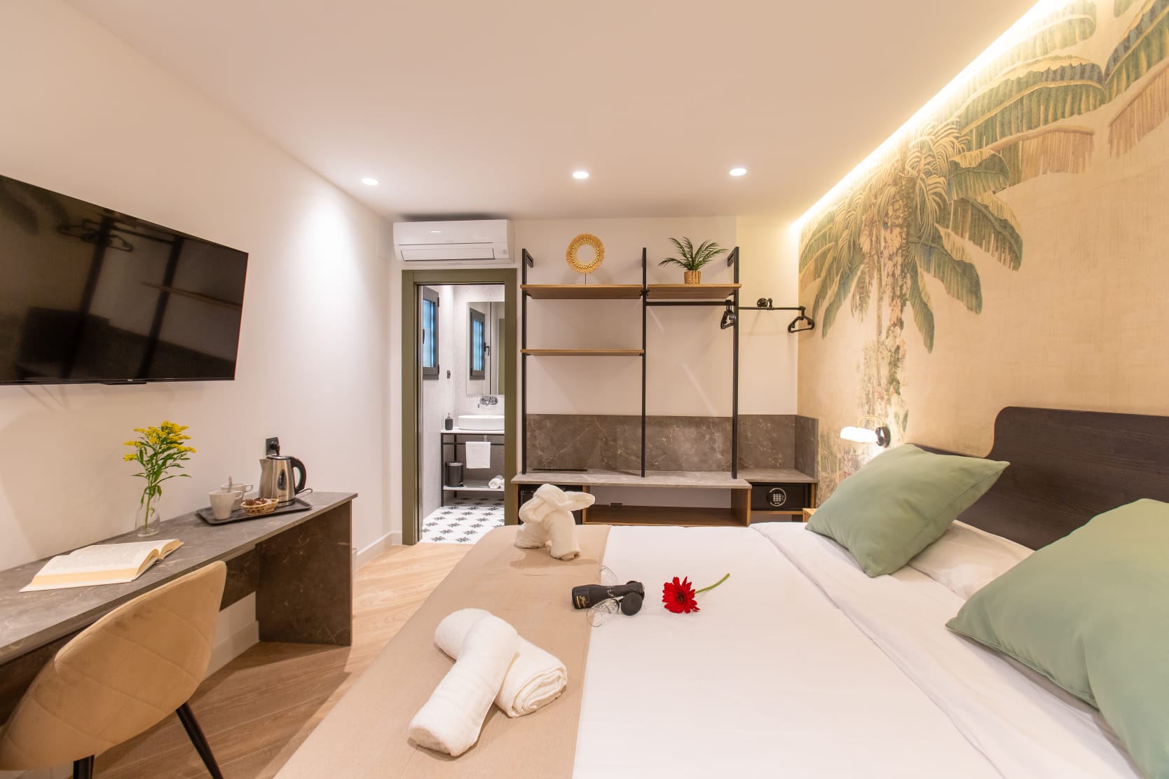 Nuestra Junior Suite ofrece un refugio lujoso y sofisticado en el corazón del hostal. Esta amplia habitación está diseñada para ofrecer el máximo confort y estilo, con un papel tapiz decorado con exuberantes palmeras que aporta un toque tropical al espacio. El diseño combina hermosamente elementos contemporáneos y clásicos, creando una atmósfera serena y acogedora. La suave iluminación ambiental realza el efecto relajante de la habitación, proyectando un resplandor suave que invita a la calma. Además, dispone de una pequeña terraza exterior con mesa y sillas, el lugar perfecto para disfrutar de un café por la mañana o relajarse al aire libre. Con su diseño elegante, su encanto tropical y su tranquila terraza, la Junior Suite ofrece la combinación perfecta de lujo y confort para una estancia inolvidable.