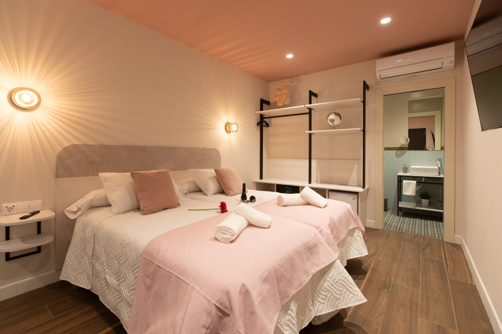 Decorada en suaves tonos rosados, crea un ambiente acogedor y sofisticado, perfecto para el descanso. Su diseño cuidadosamente pensado incluye ropa de cama lujosa, muebles elegantes y una cómoda zona de estar que invita a la relajación. La iluminación ambiental aporta un toque cálido y armonioso, resaltando los detalles decorativos con sutileza. Como complemento ideal, la habitación cuenta con una pequeña terraza privada, equipada con una mesa y sillas, perfecta para disfrutar de un café por la mañana o una charla al atardecer. Con su atmósfera serena, esta habitación ofrece una experiencia única de confort y elegancia.