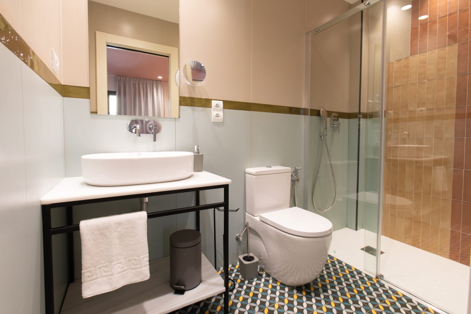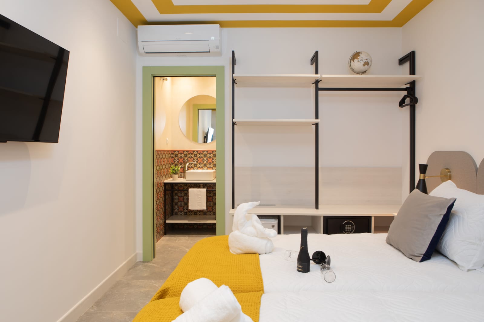 Esta moderna habitación, decorada en vibrantes tonos de amarillo y gris, ofrece una atmósfera fresca y energética. El contraste de los colores crea un ambiente dinámico y acogedor, con detalles que aportan elegancia y confort. El mobiliario es contemporáneo y funcional, con una cama de lujo y una zona de estar perfecta para relajarse. El baño es una auténtica obra de arte, con un tema azteca que aporta un toque cultural único. Los patrones geométricos en las paredes y los detalles decorativos en tonos cálidos de terracota y oro transforman este espacio en un rincón vibrante. Esta habitación ofrece una experiencia cómoda y elegante y es ideal para quienes buscan una estancia llena de estilo y originalidad.