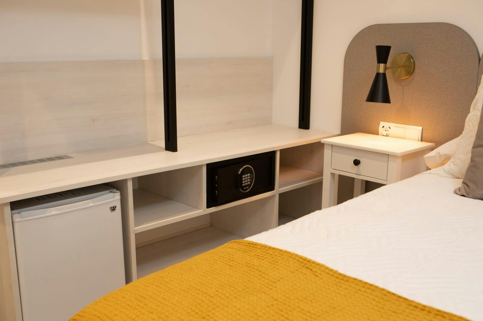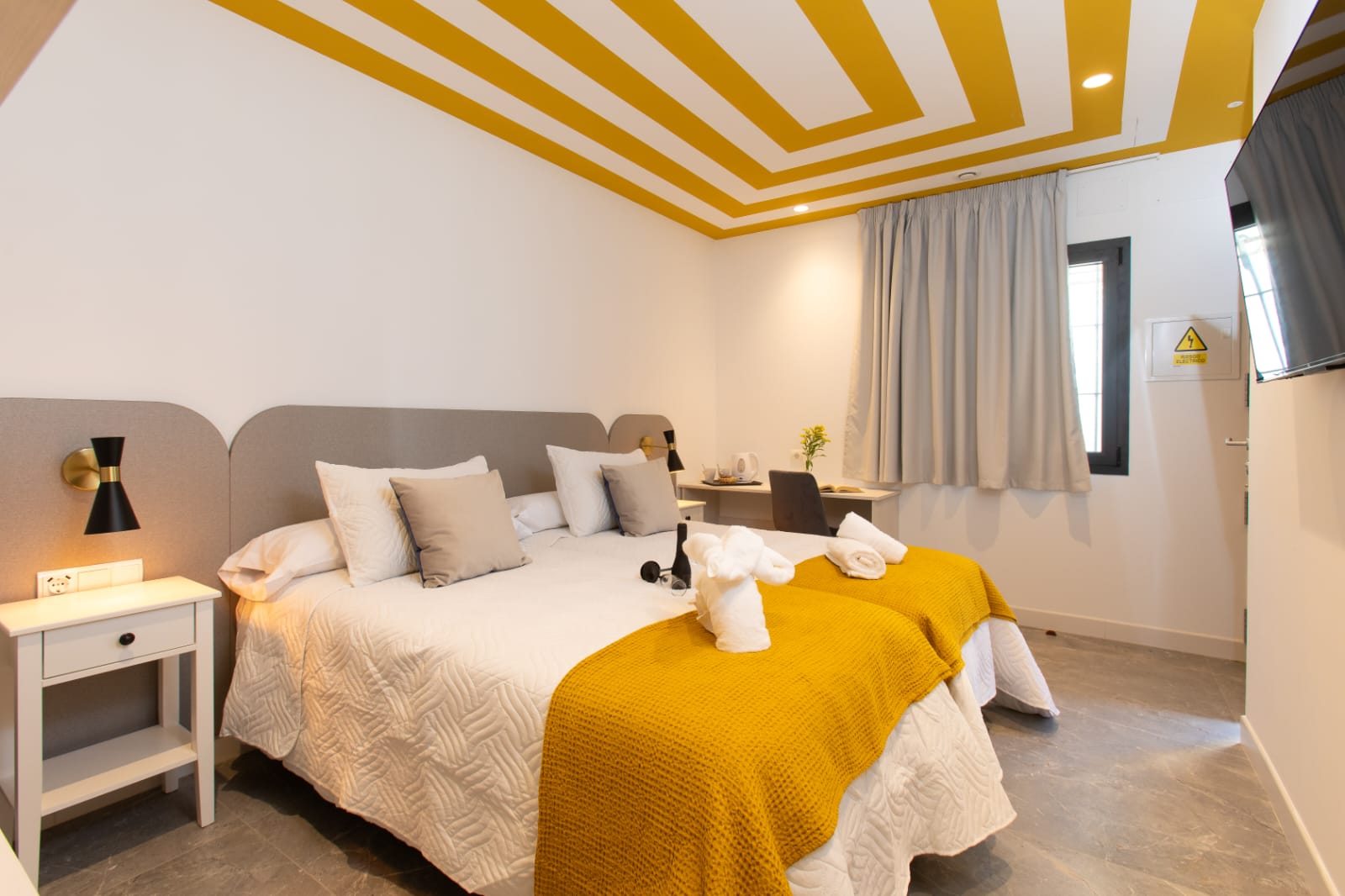 This modern room, decorated in vibrant shades of yellow and grey, offers a fresh and energetic atmosphere. The contrasting colours create a dynamic and welcoming atmosphere, with details that add elegance and comfort. The furnishings are contemporary and functional, with a luxurious bed and a sitting area perfect for relaxing. The bathroom is a true work of art, with an Aztec theme that adds a unique cultural touch. Geometric patterns on the walls and decorative details in warm tones of terracotta and gold transform this space into a vibrant corner. This room offers a comfortable and elegant experience and is ideal for those looking for a stylish and original stay.